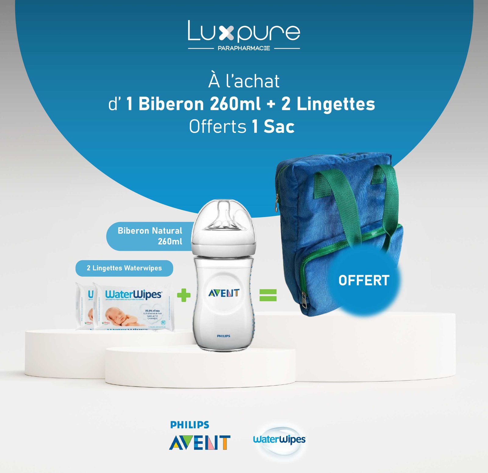 Pour vérifier la disponibilité du Avent Biberon Natural 260ml avec les lingettes WaterWipes et pour passer commande en ligne, je vous invite à visiter le site de luxpure.ma