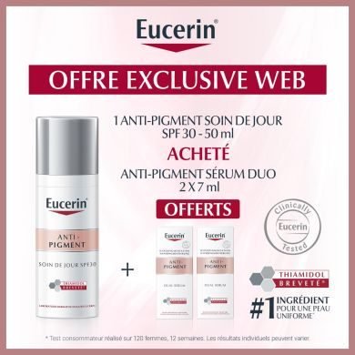 Le Eucerin Anti-Pigment Soin de Jour SPF 30 est un hydratant quotidien conçu pour réduire les taches pigmentaires et prévenir leur réapparition. Enrichi d’une protection solaire SPF 30, il protège également la peau contre les rayons UVA et UVB, responsables du vieillissement prématuré et de l’aggravation des taches pigmentaires.